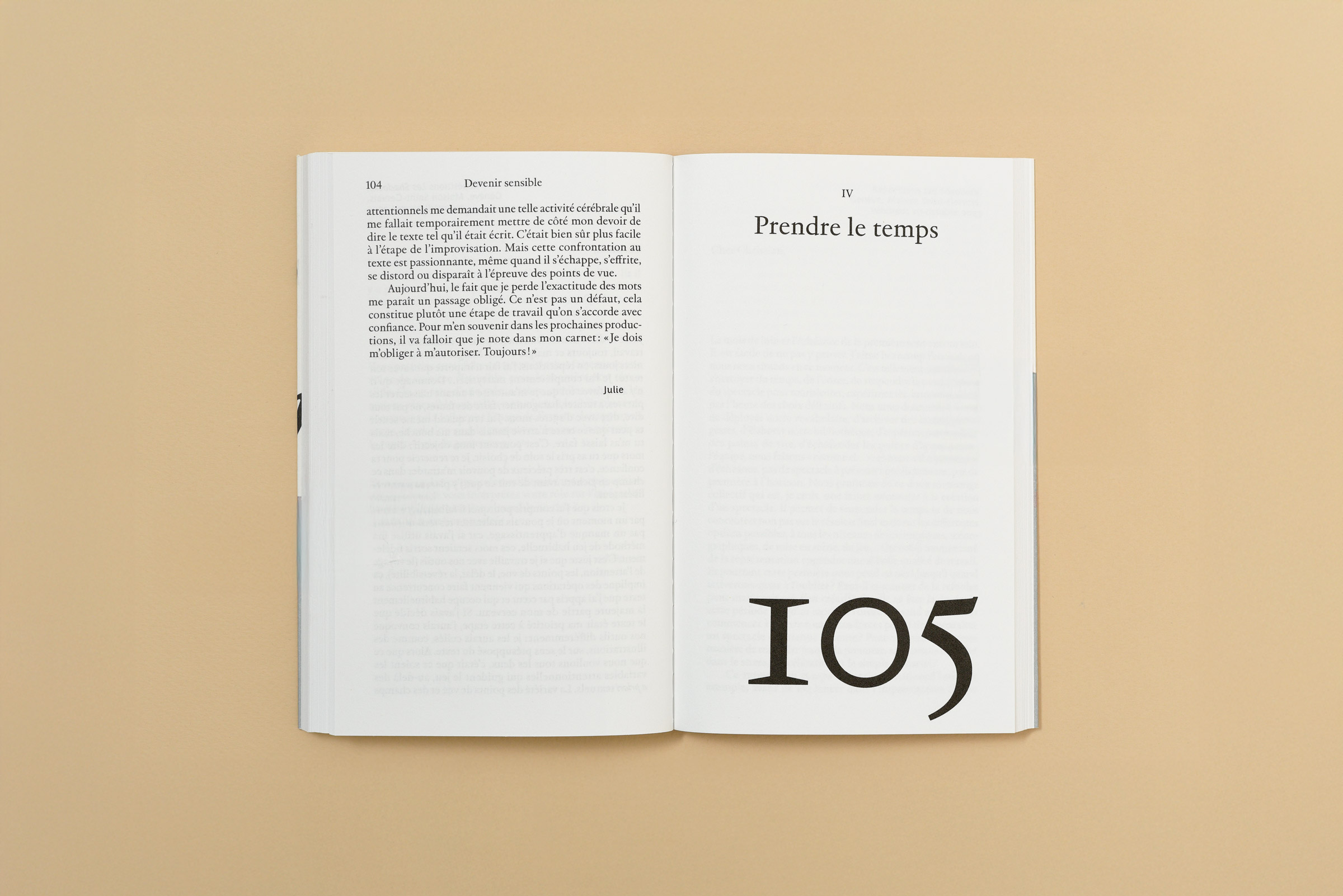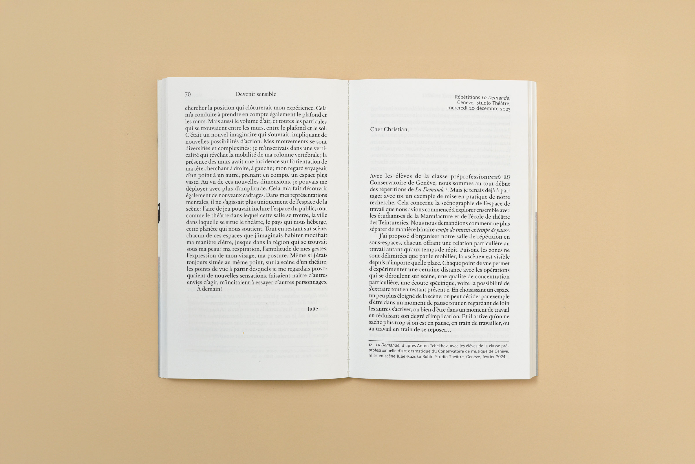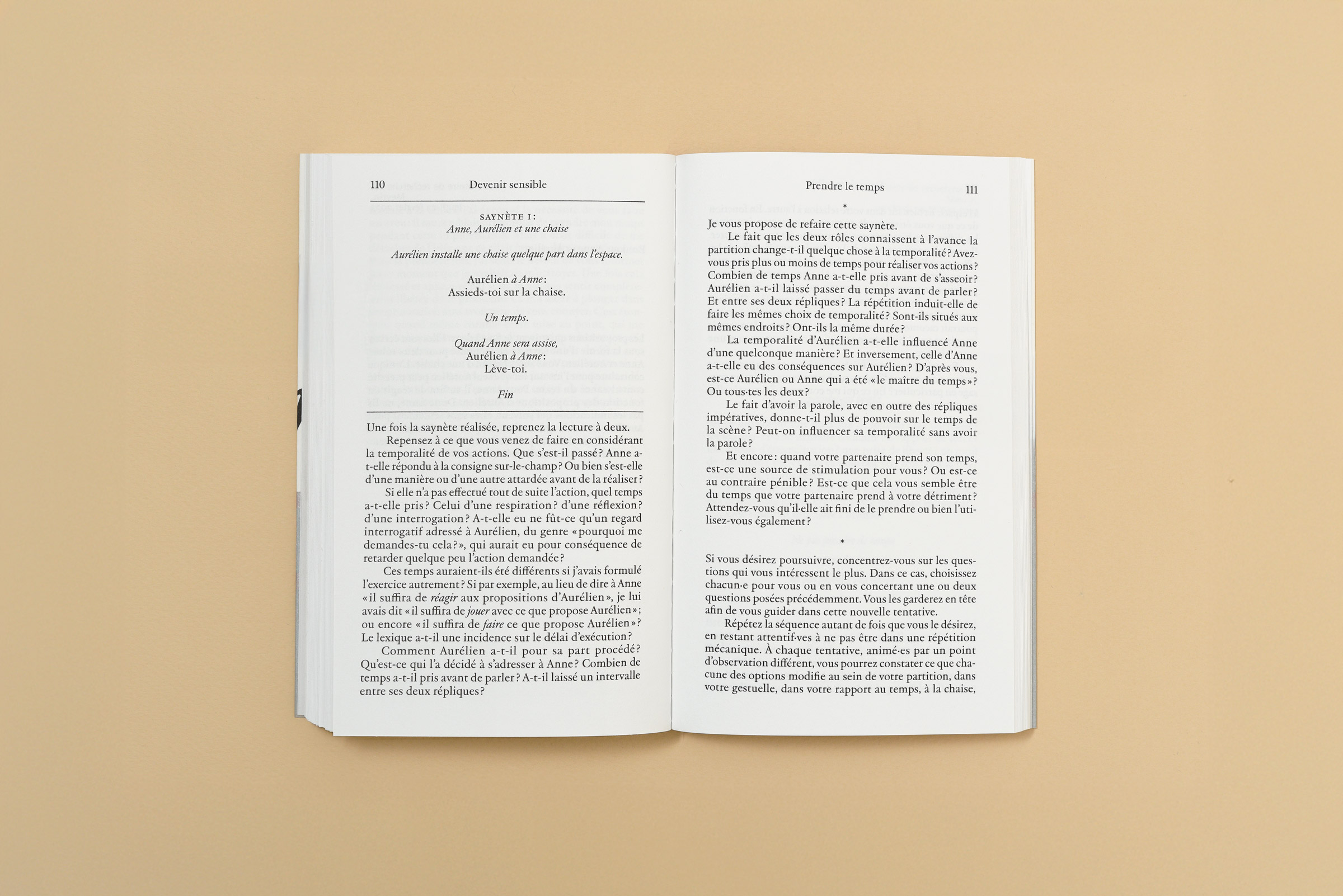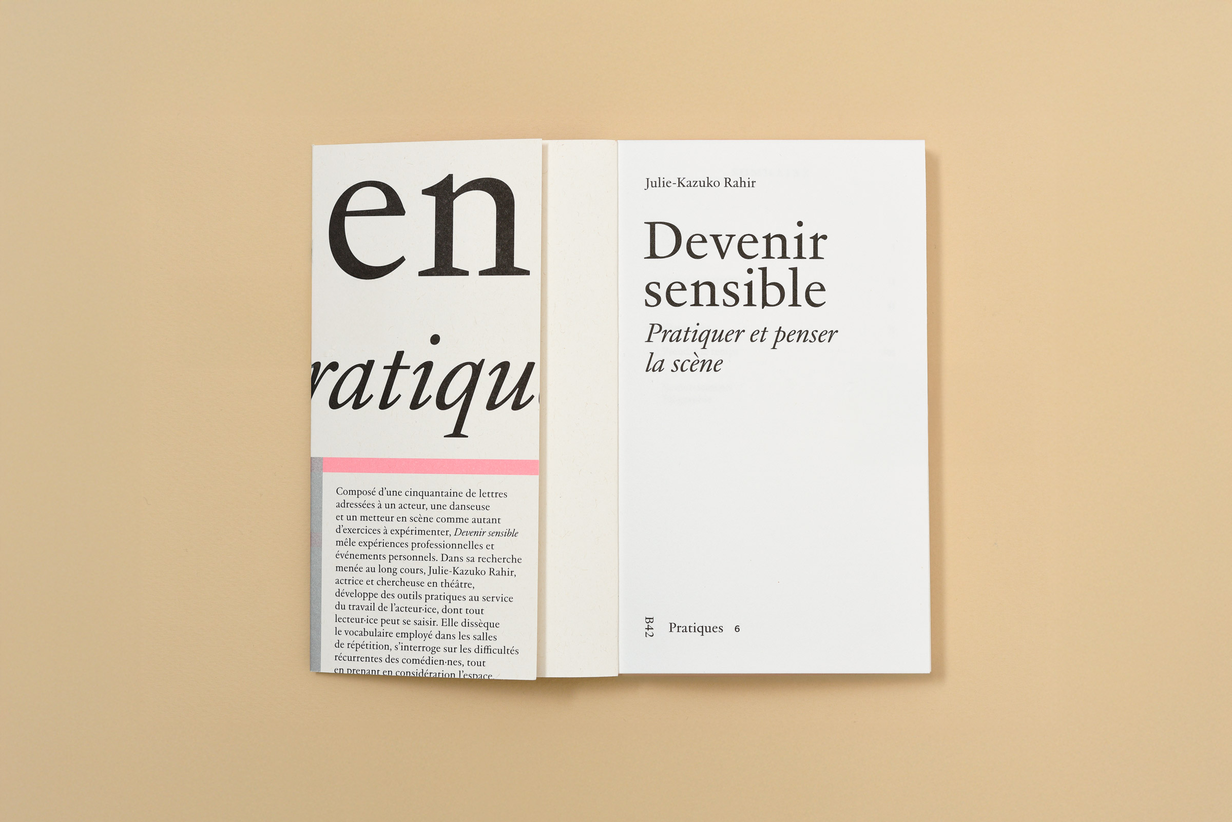Composé d’une cinquantaine de lettres adressées à un acteur, une danseuse et un metteur en scène comme autant d’exercices à expérimenter, Devenir sensible mêle expériences professionnelles et événements personnels. Dans sa recherche menée au long cours, Julie-Kazuko Rahir, actrice et chercheuse en théâtre, développe des outils pratiques au service du travail de l’acteur·ice, dont tout lecteur·ice peut se saisir. Elle dissèque le vocabulaire employé dans les salles de répétition, s’interroge sur les difficultés récurrentes des comédien·nes, tout en prenant en considération l’espace, le temps et le mouvement de la pensée et des émotions. Son approche, nourrie par la technique somatique du Feldenkrais, permet d’observer de multiples changements sur soi-même et dans la relation aux autres.